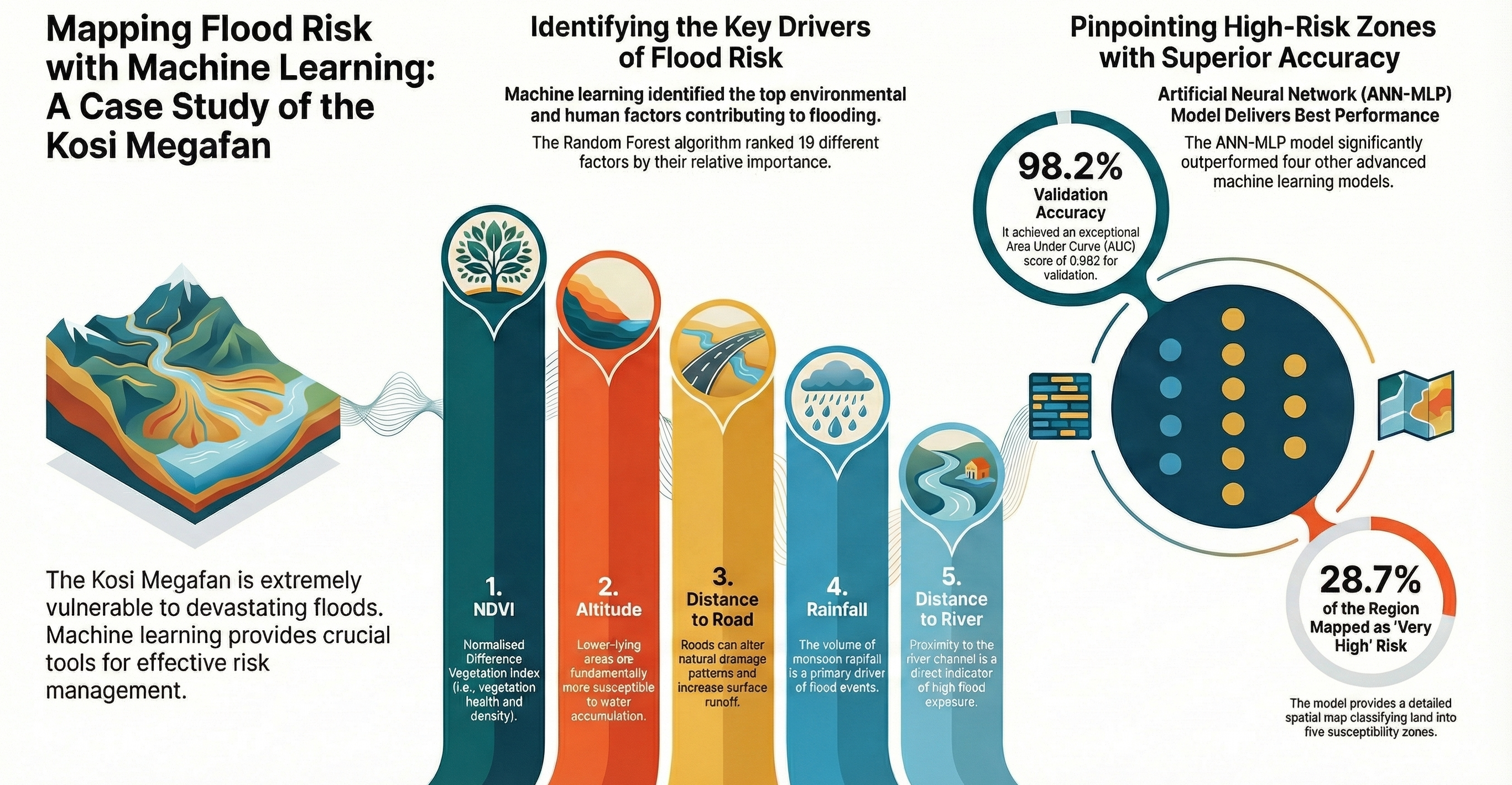 My latest work in the Kosi Megafan utilizes Artificial Neural Networks (ANN-MLP) to identify high-risk zones that traditional models miss. The model achieved a validation accuracy of 0.982, significantly outperforming Random Forest and MaxEnt approaches.