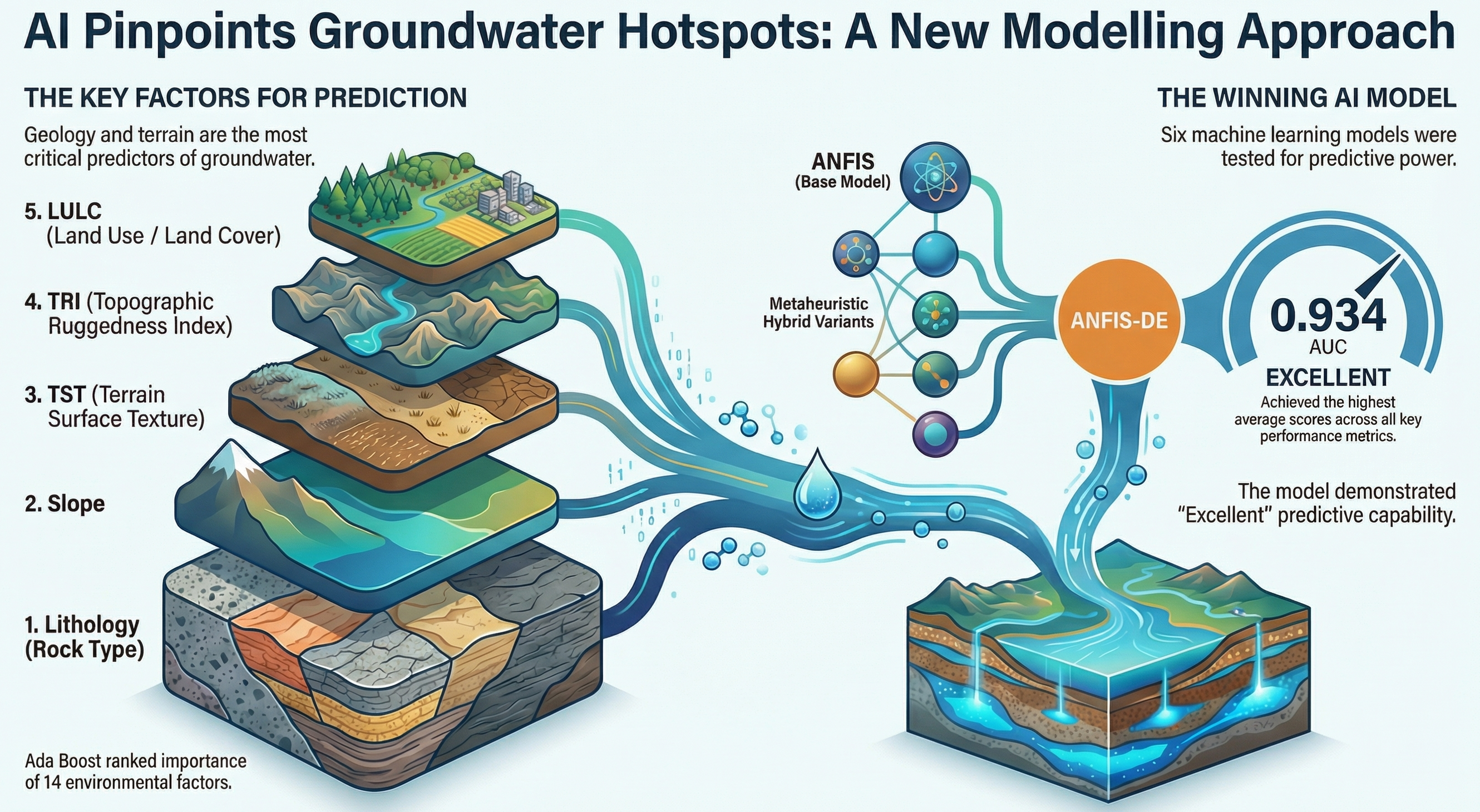 Using ANFIS-DE hybrid models to pinpoint groundwater hotspots based on 14 environmental factors including Lithology and TST.