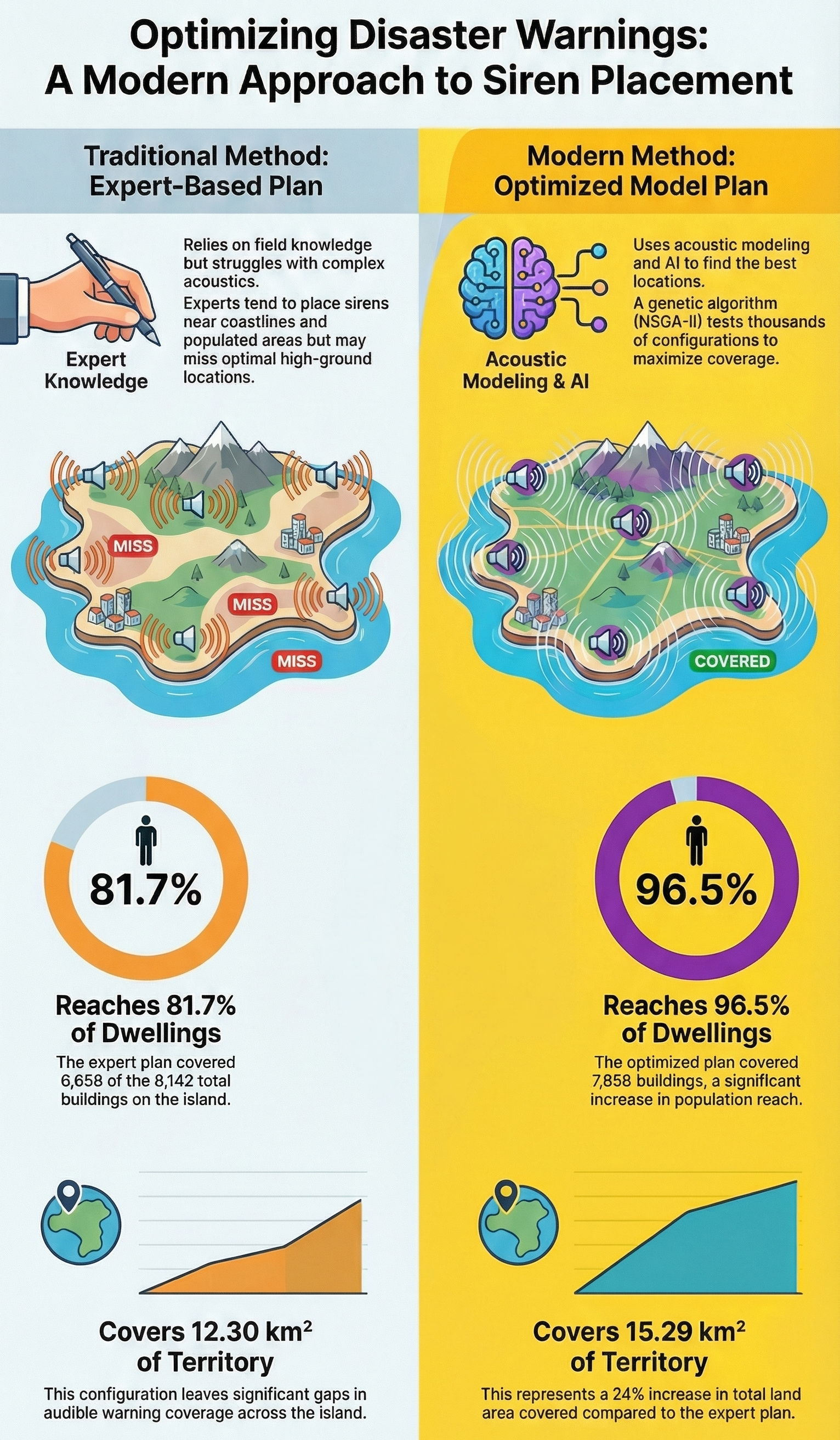 A comparison of Traditional Expert-Based planning vs. AI-driven optimization (NSGA-II) for siren placement. The Modern Method increased dwelling coverage from 81.7% to 96.5%.