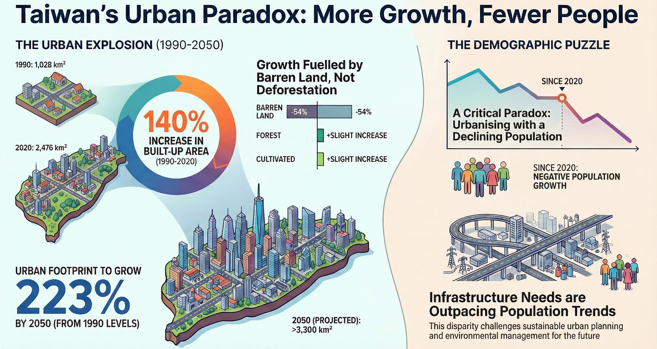 Visualizing the disconnect between a 140% increase in built-up area and negative population growth. A critical study for sustainable urban planning.