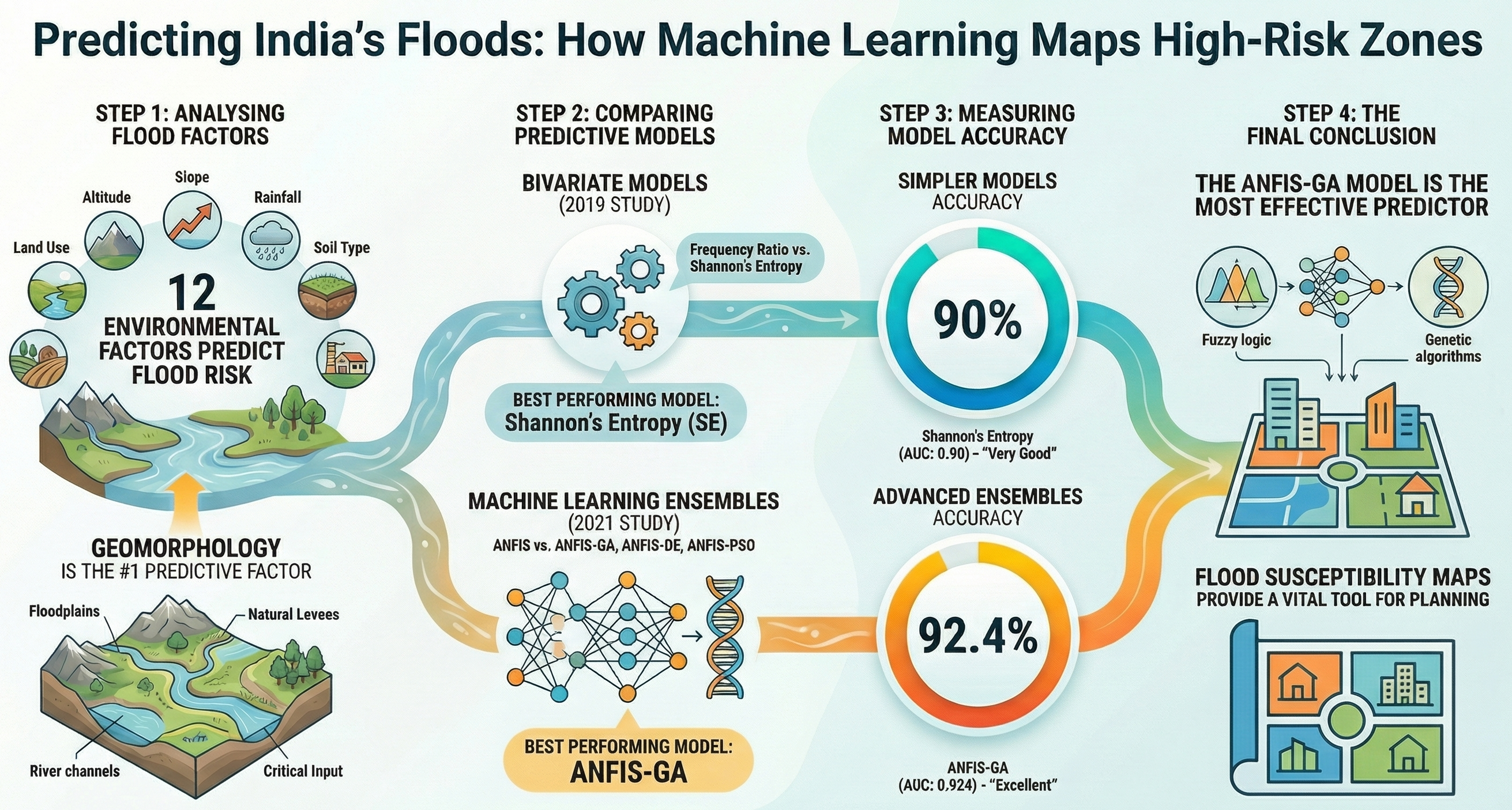 Optimized 5 ML algorithms to map flood risks. The ANN-MLP model achieved 98.2% accuracy, identifying that 28.7% of the region is at 'Very High' risk.